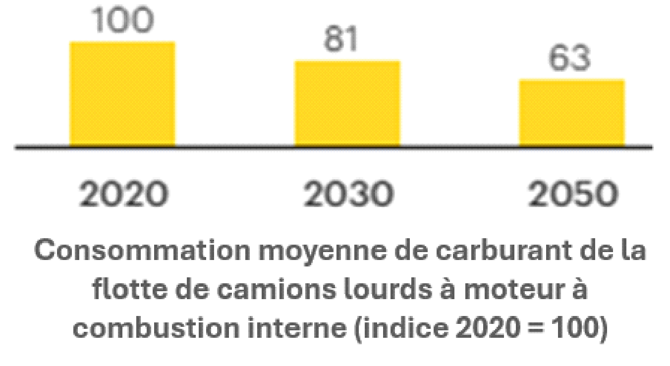 Dans le cas particulier de l’efficacité énergétique, les jalons pour la consommation de fuel des poids lourds thermiques sont ainsi un réduction de 19% en 2030 et 37% en 2050 par rapport à 2020, ainsi que le montre le graphique ci-contre.