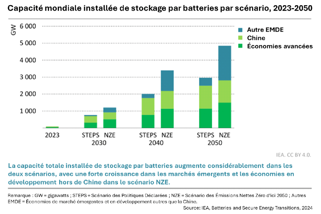 Les capacités installées de ces batteries ont évolué avec la part des ERV dans le système. Selon L’AIE, elles ont connu une croissance exponentielle au cours de la dernière décennie. Elles sont ainsi passées de 1 GW en 2013, à plus de 85 GW en 2023, année qui a vu un ajout de 42 GW, plus du double de la quantité ajoutée en 2022. Ce rythme de croissance est appelé à se poursuivre et même à s’accélérer, selon l’AIE, pour mettre les capacités de stockage par batterie au niveau des puissances installées d’ERV que requiert la réalisation de la carboneutralité d’ici 2050. Selon le scénario Zéro Émissions Nettes d’ici 2050 (NZE2050) de l’AIE, ces capacités doivent être multipliées par 14 pour atteindre 1 200 GW d’ici 2030, et par environ 60 pour atteindre 5 000 GW d’ici 2050.