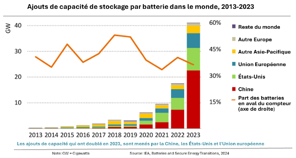 La chine a pris la tête du marché mondial de stockage au début des années 2020. Sa part dans les ajouts est passée de 20% en 2019 à 55% en 2023, lesquels ont triplé pour atteindre 23 GW à cette date. Deux tiers de ces ajouts sont à échelle de réseau. Les grands utilisateurs commerciaux plutôt que résidentiels sont les bénéficiaires des stockages en aval des compteurs qui ont eux aussi connu une forte croissance grâce à des réformes tarifaires dédiées.