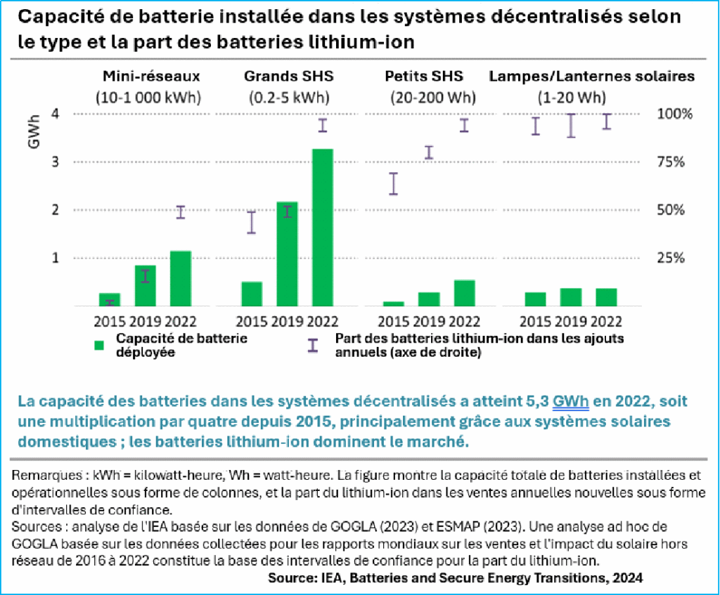 Le graphique ci-dessous donne une bonne idée des capacités des types de batteries installées dans les différents systèmes décentralisés. Les batteries lithium-ion dominent le marché.