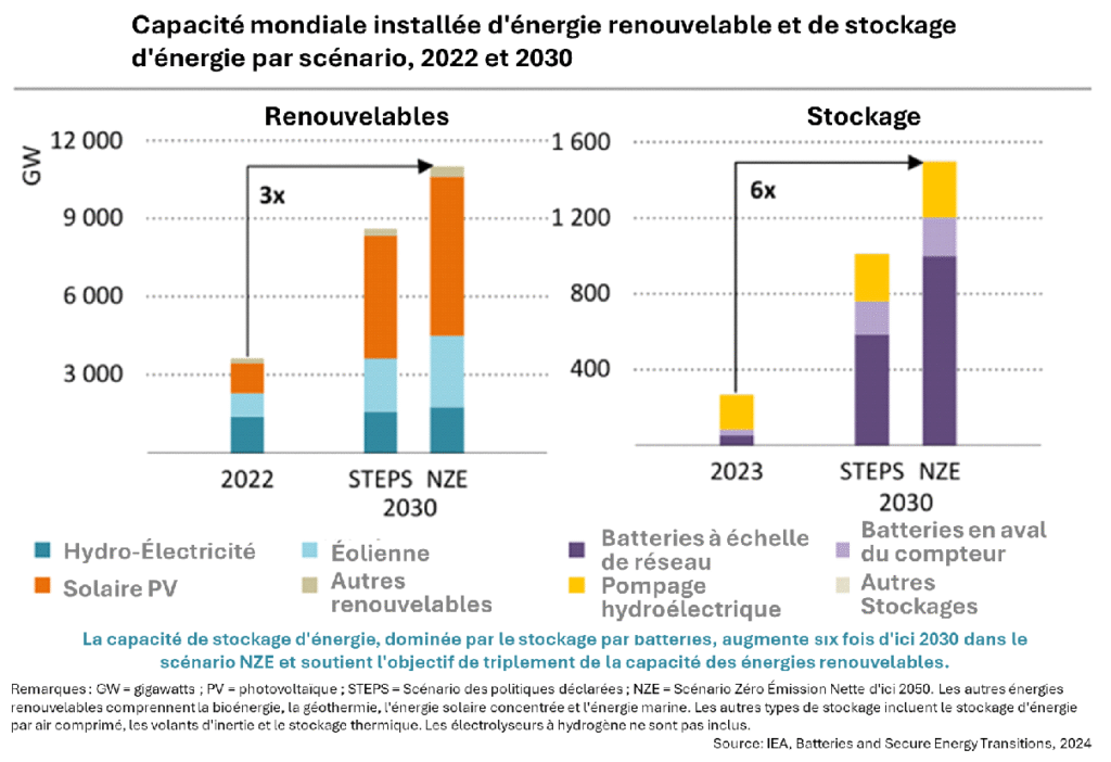 Le graphique ci-dessous donne un aperçu des besoins de croissance des capacités de stockage nécessaires pour répondre à ces objectifs, en ce qui concerne notamment les ERV. Dans le scénario zéro émissions nettes d’ici 2050 (NZE2050) de l’AIE, qui s’inscrit dans la perspective de la carboneutralité d’ici 2050 et le respect de la limite de 1,5°C pour l’augmentation de la température moyenne mondiale d’ici 2100, le triplement de la capacité mondiale en énergies renouvelables s’accompagne d’une multiplication par six du stockage total d’énergie qui atteindrait, en 2030, 1 500 GW. Le facteur multiplicateur est de 14 pour les batteries dont la capacité installée passerait de 85 GW en 2023 à 1 200 GW en 2030.