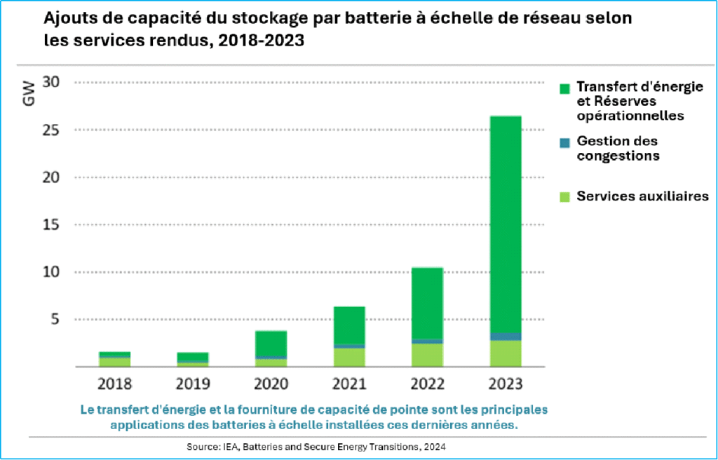 Dans son rapport spécial, l’AIE détaille l’ensemble de ces services en distinguant le stockage par batteries à échelle de réseau, du stockage par batteries en aval du compteur