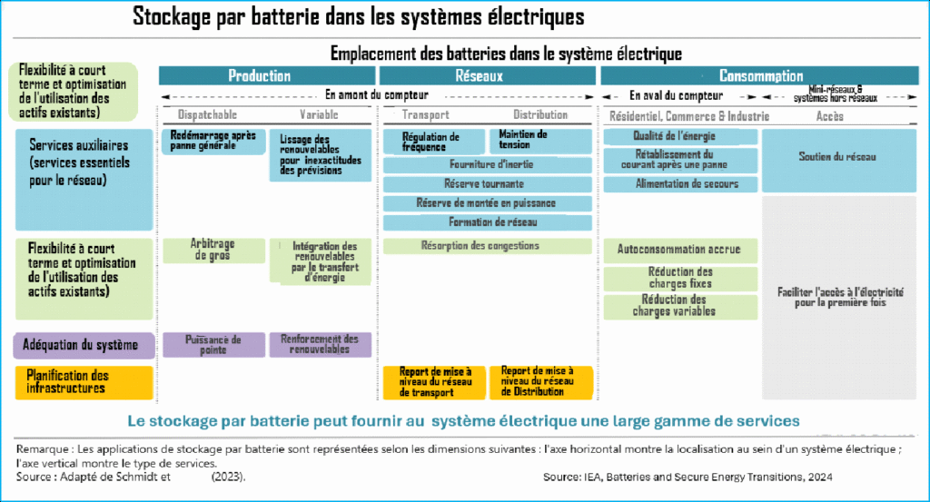 Les stockages d’énergie par batterie à échelle de réseau et en aval des compteurs ont été introduits dans les systèmes électriques avec les énergies renouvelables variables (solaires, éoliennes), principalement pour en palier l’intermittence. Ils complètent, avec plus de de flexibilité et de rapidité, les systèmes traditionnels de stockage d’énergie propre à grande échelles comme le pompage-turbinage hydroélectrique. Ces caractéristiques (flexibilité et rapidité) sont en train de les imposer dans les systèmes électriques en transition grâce à la variété des services qu’ils peuvent rendre et qu’ils rendent déjà. Le tableau ci-dessous nomme ces services dans les différents compartiments des systèmes électriques, la production, le réseau (transport et distribution) et la consommation.