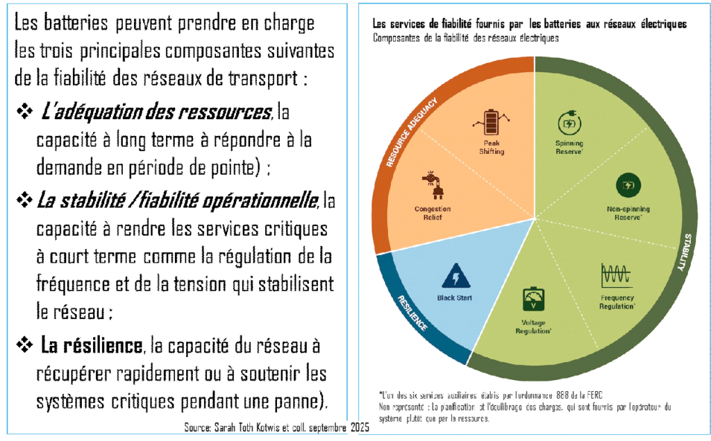 Elles donnent par la même occasion un nouveau souffle, avec une plus grande protée et beaucoup de flexibilité, à toute la gamme des services que procure le stockage de l’énergie dans le système électrique, modifiant de ce fait, en profondeur, les dynamiques en jeu dans son exploitation et son développement. Ces services, qui améliorent de façon générale sa fiabilité, vont du transfert d’énergie, à l’adéquation des ressources et à différents services auxiliaires qui contribuent avantageusement au renforcement de sa stabilité et de sa résilience.