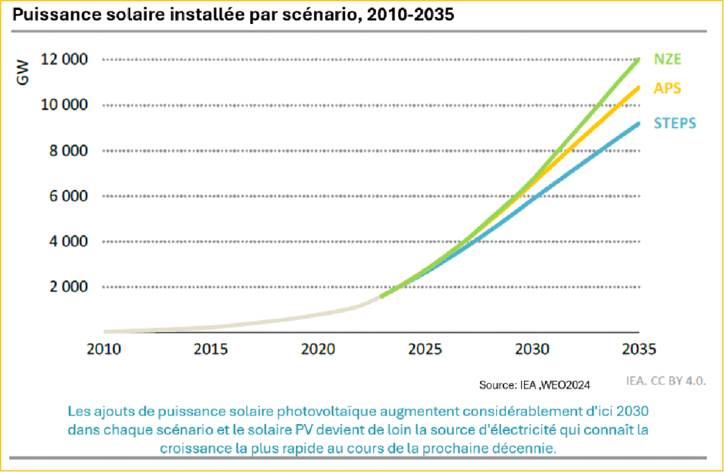 Le graphique ci-dessous montre l’évolution de la puissance solaire mondiale installée pour chacun des 3 scénarios. Elle doublerait si tous les engagements pris sont mis en œuvre (APS). Il faudrait cependant la multiplier par 2,5 pour mettre le monde sur la trajectoire de la carboneutralité (NZE2050).