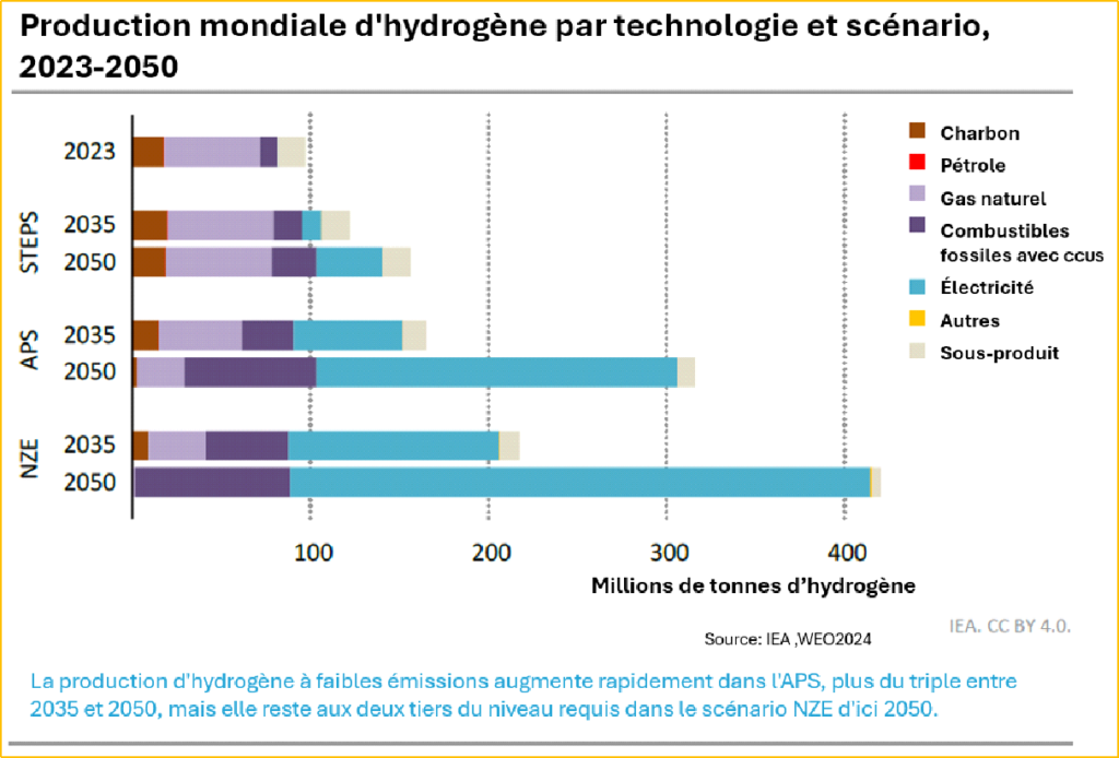 Sa production dépend aujourd’hui majoritaire des combustibles fossiles. Elle a atteint en 2023, 97 millions de tonnes (Mt) provenant principalement du gaz naturel (63%) et du charbon (20%) sans recours au CCUS (captage, stockage et utilisation du carbone). 16% tiennent de l’hydrogène dérivé.