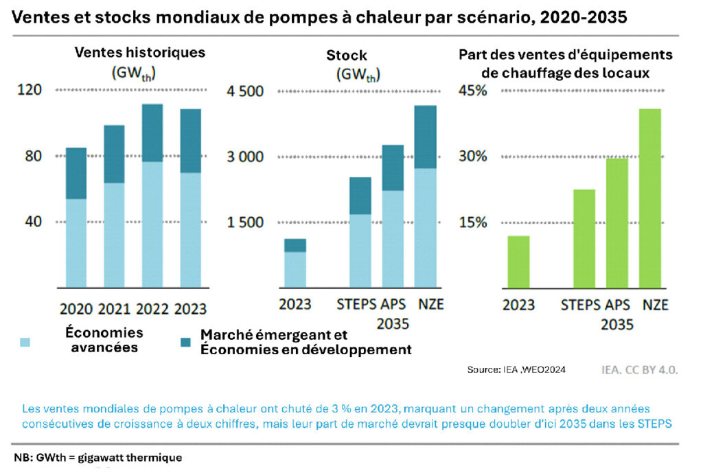 La réalité d’aujourd’hui est moins rose cependant, les ventes de ces appareils ayant baissé de 3% sur le plan mondial en 2023, malgré les 12% de croissance en Chine. Cette baisse est due, indique l’AIE, à plusieurs facteurs comprenant « la baisse des prix du gaz naturel par rapport à leurs pics de 2022, les changements de politiques et de subventions dans certains grands pays, la baisse de la construction de nouveaux bâtiments et l’aversion générale des consommateurs pour les produits coûteux, dans un contexte de taux d’intérêt et d’inflation élevés ».
