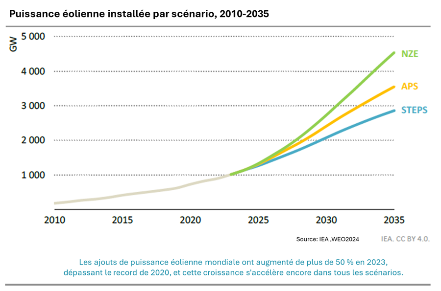 Les puissances électriques éoliennes mondiales installées dépassent ainsi 2 800 GW pour 7 500 GWh de production si les politiques déclarées (STEPS) sont effectivement mises en œuvre, faisant de l’éolien, indique l’AIE, la deuxième source mondiale d’électricité. Dans les deux autres Scénarios, APS et NZE2050, caractérisés par l’accélération de l’électrification des usages et le déploiement des énergies à faibles émissions de CO2, les puissances installées atteindraient respectivement 3 500 GW et 4 500 GW d’ici 2035. Le dernier chiffre reflète les efforts requis dans le déploiement de l’éolien pour réaliser la carboneutralité d’ici 2050.