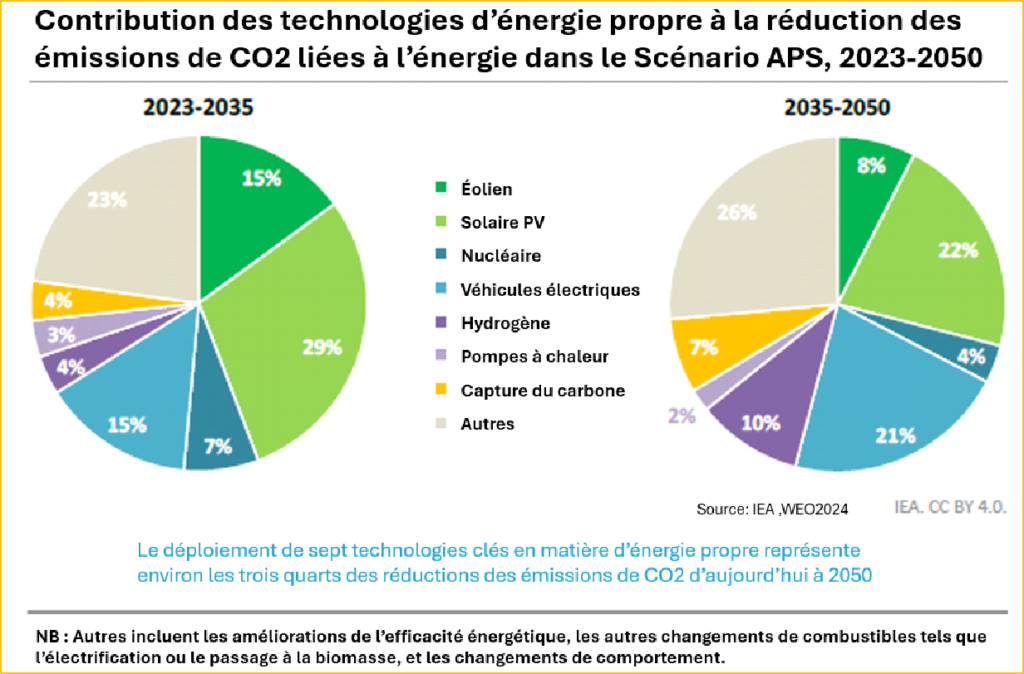 Les 7 (sept) technologies d’énergie propres considérées dans WEO2024 sont le Solaire photovoltaïque, l’Éolien, le Nucléaire, les Véhicules électriques, les Pompes à chaleur, l’Hydrogène à faibles émissions et la capture du carbone. Elles jouent un rôle clé dans la réductions des émissions de CO2 liées à l’énergie. Elles contribueraient ainsi, à elles seules, à trois quarts de ces réductions entre 2023 et 2035 et au-delà, dans le Scénario APS. La figure ci-dessous donne un aperçu de leurs contributions respectives.  Cette figure montre aussi la place importante que tiendraient les autres mesure de réduction des émissions que sont, l’efficacité énergétique, l’électrification des usages et les changements de comportement des consommateurs.