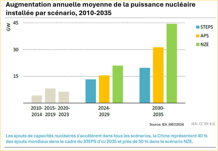 En 2024, Sept (7) nouveaux réacteurs nucléaires ont été connectés au réseau  notamment en Chine, en Inde, aux Émirats arabes unis, aux États-Unis et en France, ajoutant 8,1 GW aux 369 GW de puissance nucléaire installée au niveau mondial. Huit nouveaux chantiers dont 6 en Chine ont démarré. Un total de 62 réacteurs d’une capacité de 75 GW sont aujourd’hui en construction, permettant d’accroître de 20% la puissance nucléaire installée au niveau mondial, ajoute l’AIE.