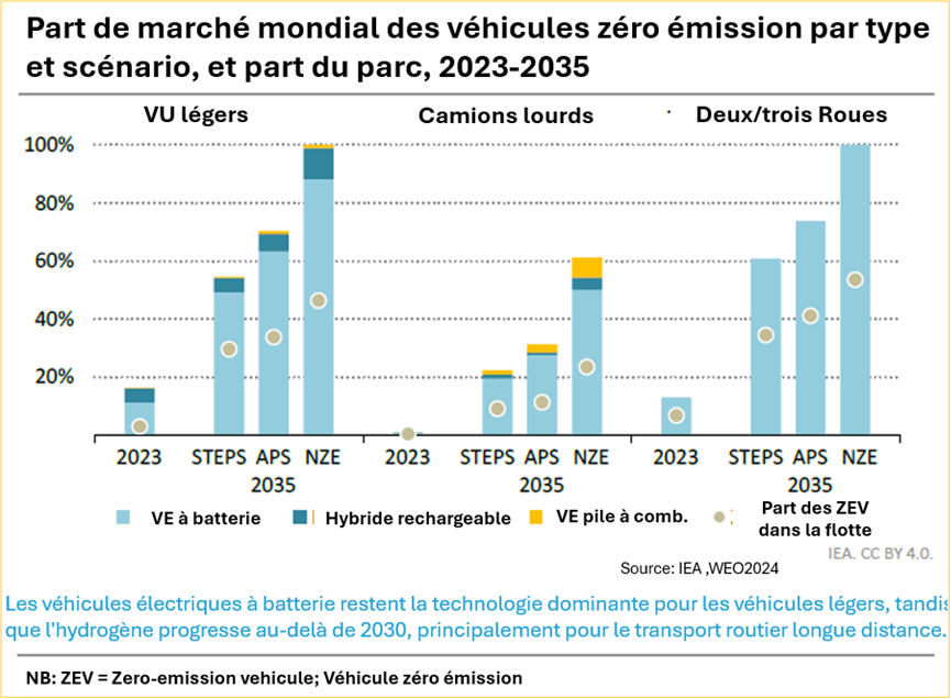 La part des véhicules électriques dans les ventes mondiales progressent dans tous les scénarios, atteignant par exemple 55% en 2035 dans le scénario politiques déclarées (STEPS). Les principaux moteurs de cette croissance, indique l’AIE, sont l’expansion rapide du marché chinois des véhicules électriques, les nouvelles réglementations de l’Agence de Protection de l’Environnement (EPA) aux États-Unis (Trump les maintiendra-t-il?), les normes d’émissions de CO2 dans l’Union européenne et le lancement de nouveaux modèles de véhicules électriques sur des marchés comme l’Inde, l’Asie du Sud-Est et l’Amérique latine.